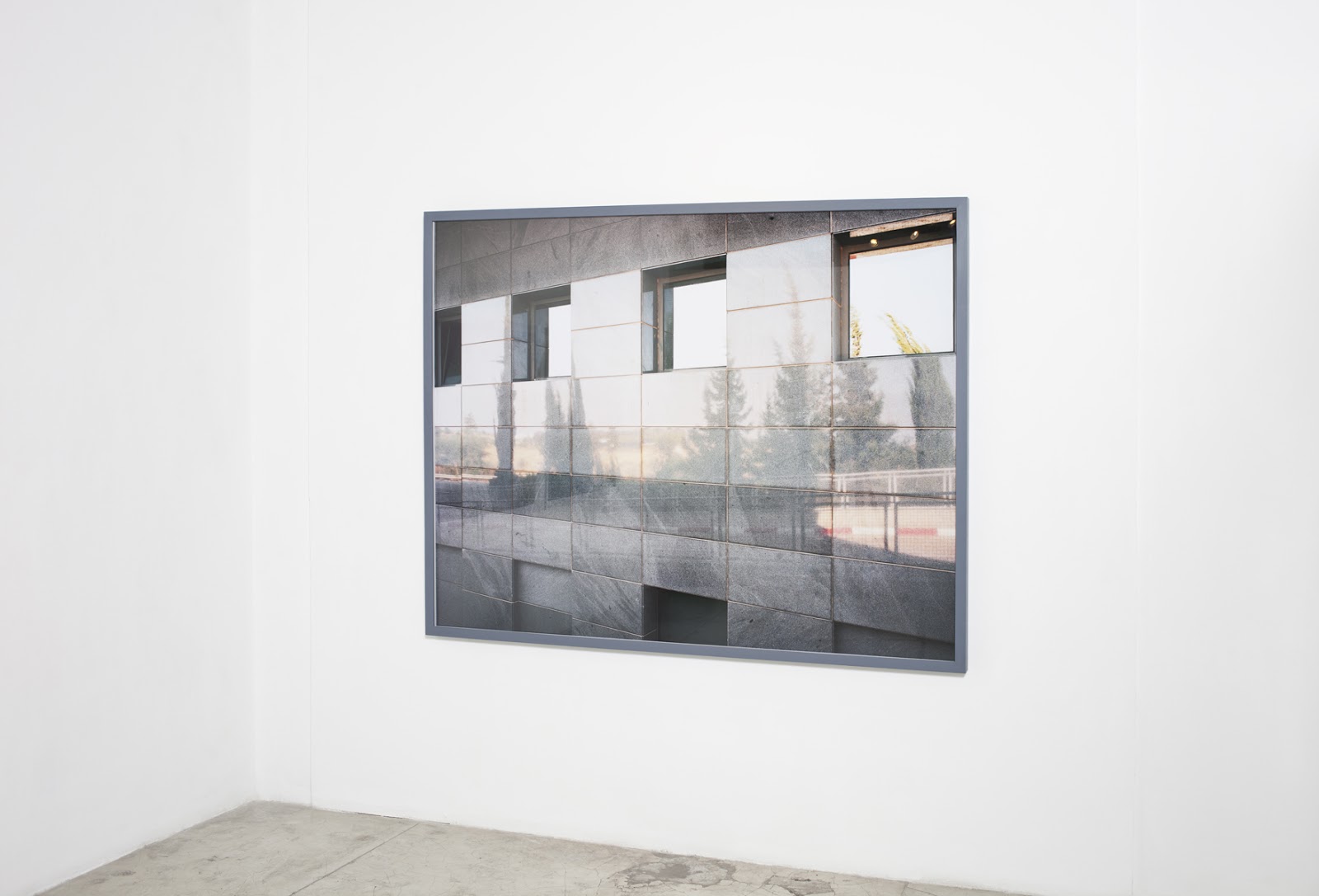 בתצלום אחד מרחב נופי משתקף בתוך קיר שַיִש המזוהה בדרך כלל כאובייקט זיכרון.